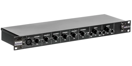 The MX624 is a six-channel mixer with two stereo zone outputs.
